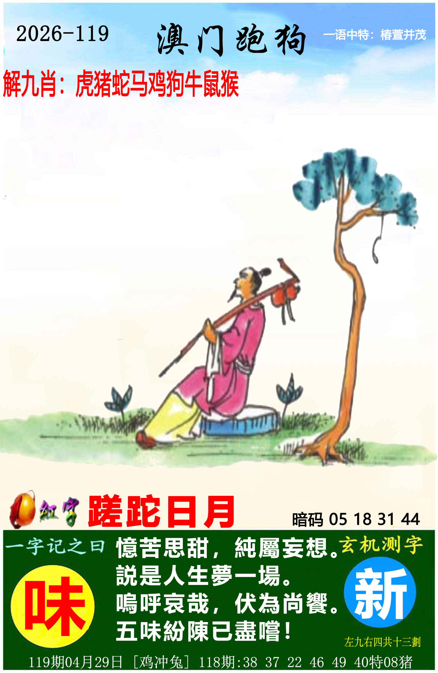解析:这几句带有人生感慨与劝世意味:“望天打救,解我倒悬”:处境危急,盼望解脱,对应猴(机灵求生)、鸡(司晨报晓,盼天明)。“思不从兮空自伤”:空想无益,徒增悲伤,对应兔(敏感多愁)、羊(柔顺易伤)。“面对现实,莫想当年”:放下过去,务实向前,对应牛(踏实)、马(向前)、狗(忠诚于当下)。“多识故侯悲宿草”:见过荣枯,知世事无常,对应鼠(善存粮知饥荒)、龙(兴衰起伏)、蛇(蜕变重生)。选生肖:鼠、牛、兔、龙、蛇、马、羊、猴、狗。它们代表“从求救、感伤到务实、看透”的转变,也暗合诗中“解倒悬、弃空想、面对现实、知无常”的递进