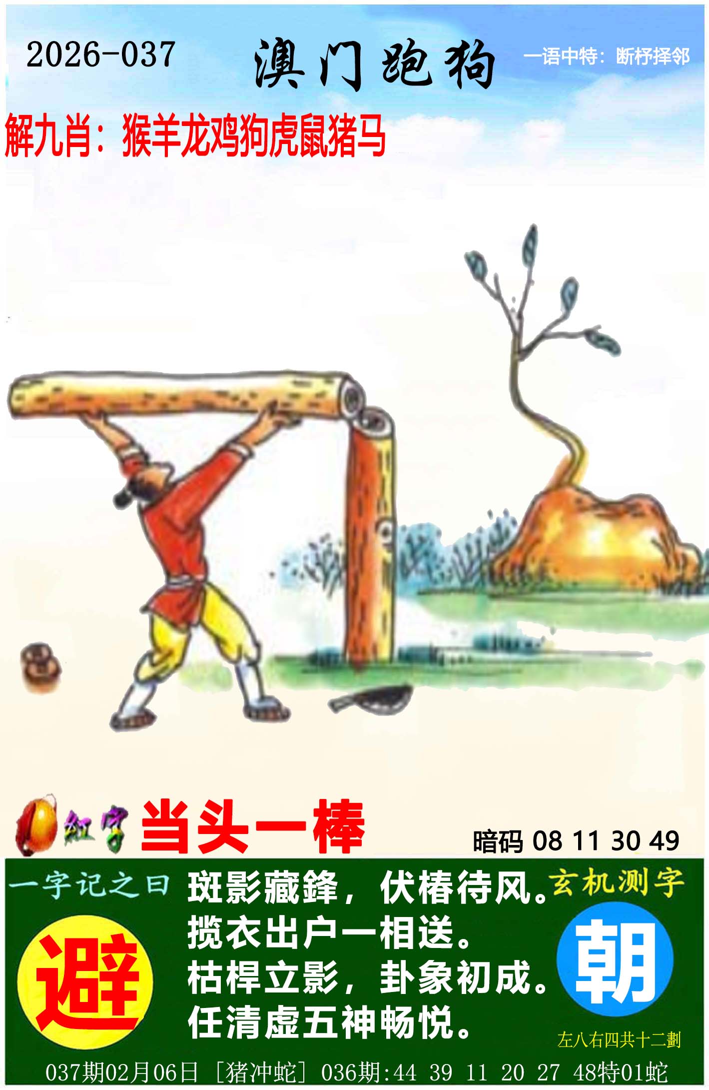 解析:【斑影藏锋,伏椿待风】喻龙蛇藏锐、虎兔伺机而动;【揽衣出户一相送】如骏马踏夜启程;【枯悍立影,卦象初成】若戍狗守正、雄鸡破晓定乾坤;【任清虚五神畅悦】恰灵猴悟道、玄鼠通幽,老牛耕云自得。九肖各司其象:龙蛇蓄势,虎兔借风,马赴前程,犬定乾纲,鸡鸣天白,猴通慧根,鼠游太虚,牛守清虚——独缺羊猪犬三肖未入此谶,然天地枢机已蕴锋芒。(注:犬在文中重复出现,实际涵盖生肖为龙、蛇、虎、兔、马、鸡、猴、鼠、牛)