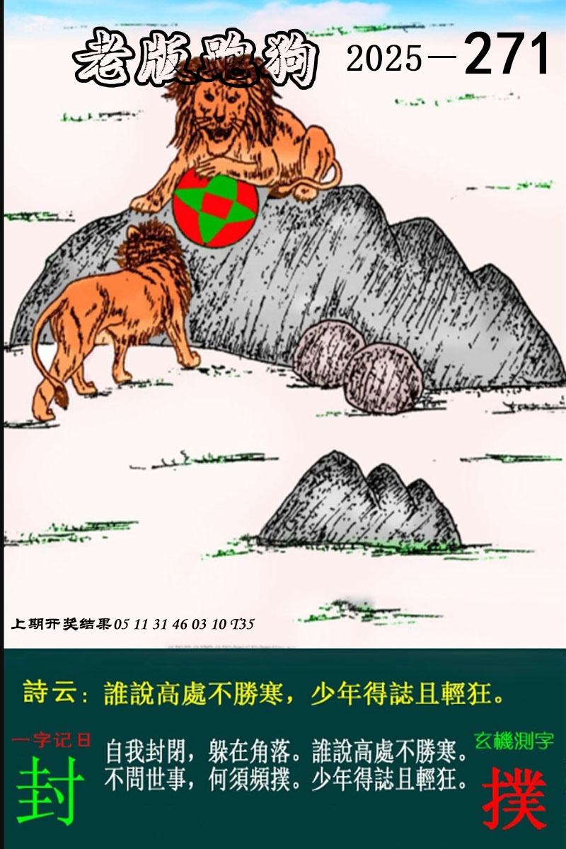 老版跑狗一字記之曰:【封】 詩云:誰說高處不勝寒,少年得誌且輕狂。自我封閉,躲在角落。誰說高處不勝寒。不問世事,何須频撲。少年得誌且輕狂。玄機測字:《撲》